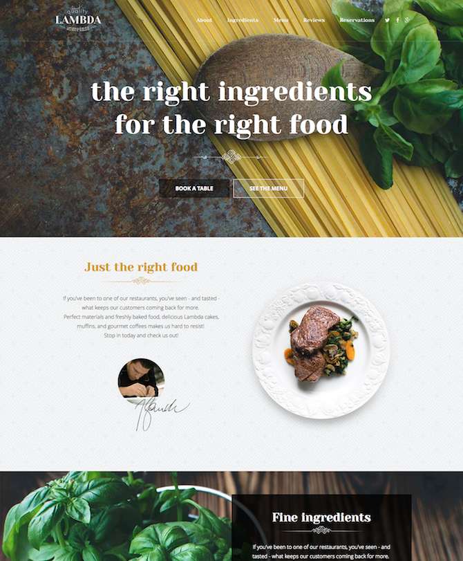 Relax, sit back and fine dine with this delicious one page restaurant template that showcases the restaurants finest foods.